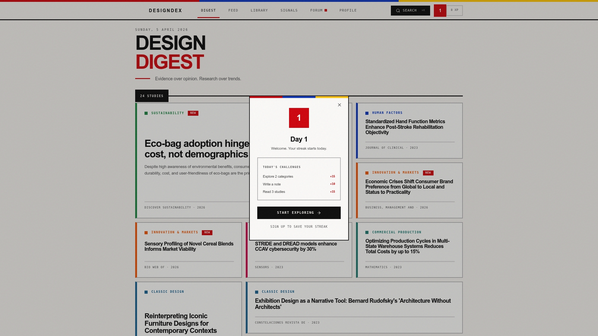 Every design decision you make carries risk. The question is whether that risk is informed or assumed. DesignDex exists to close that gap, aggregating peer-reviewed research into structured, citation-ready summaries that support faster, more defensible design decisions.