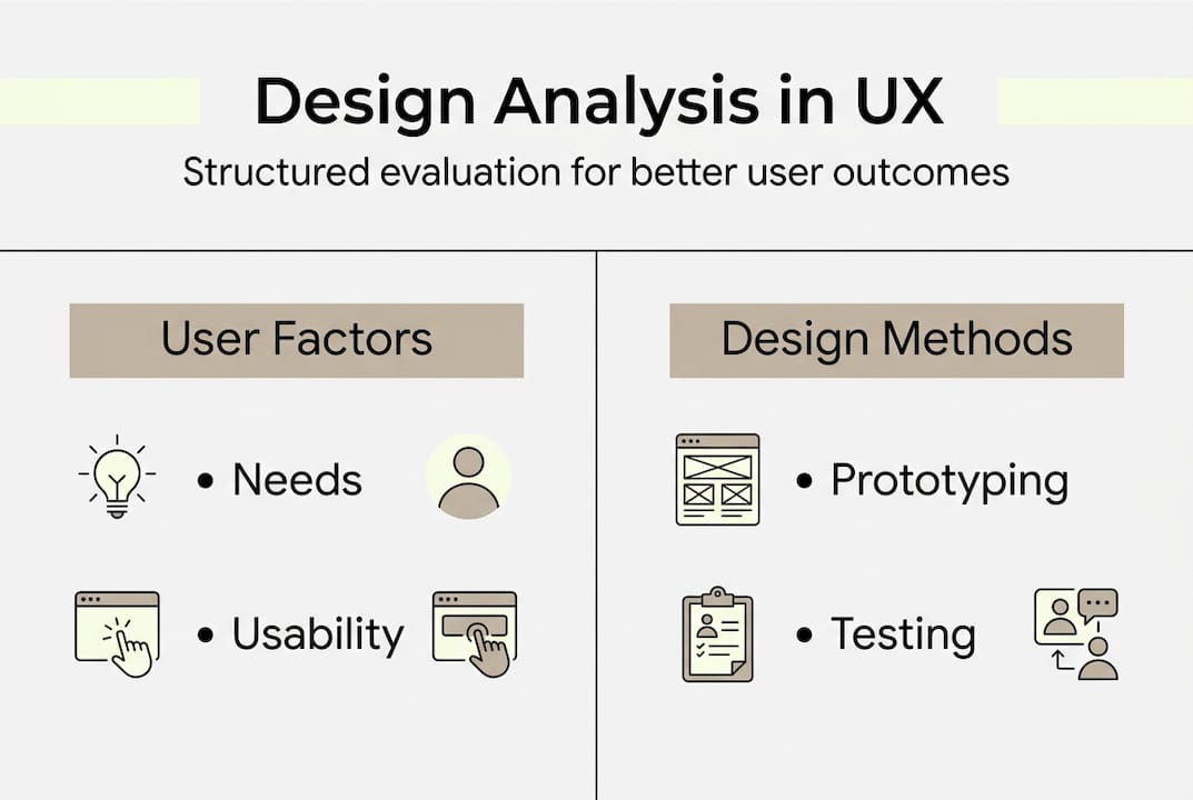 | Design analysis defined | Design analysis is a structured process to ensure user and business goals are met in UX and product design. |